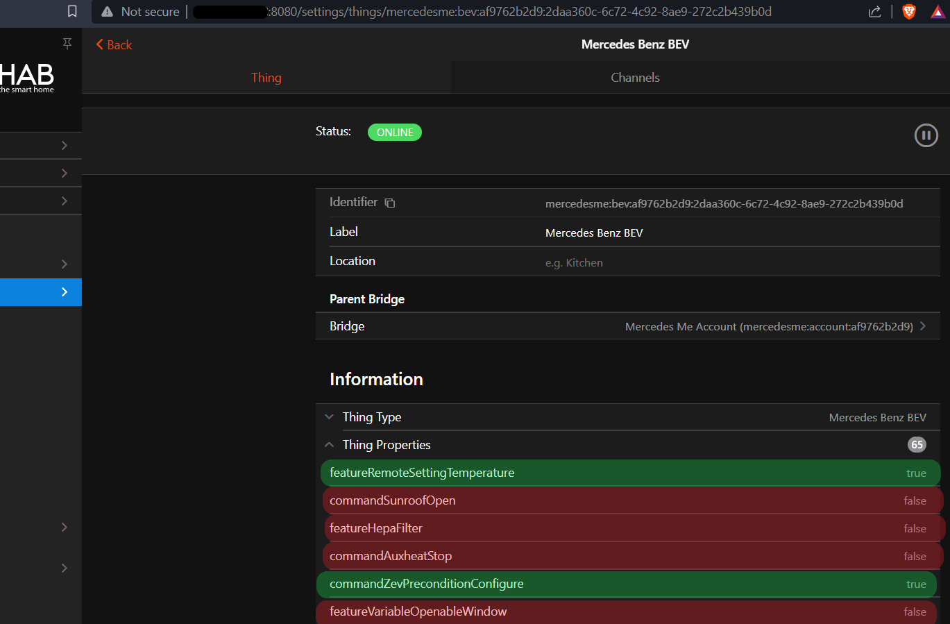 This binding provides access to your Mercedes Benz vehicle like Mercedes Me Smartphone App.
