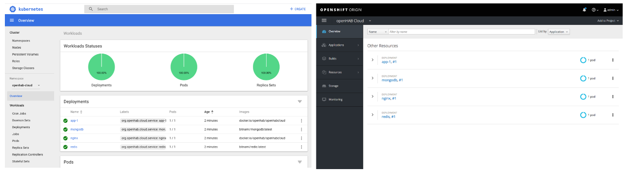 openHAB Cloud (opens new window) now supports a cloud native architecture, powered by the open source Kubernetes (opens new window) system to enable more scalable openHAB Cloud platform setups and deployments. openHAB Cloud comes with easy to use deployment scripts (opens new window) for Kubernetes and OpenShift. The Kubernetes feature relies on containers, distributed management and orchestration, and openHAB Cloud will soon completely shift into the use of microservices designed for cloud environments. More detailed information on how to deploy openHAB Cloud using Docker, Kubernetes or OpenShift can be found here (opens new window).