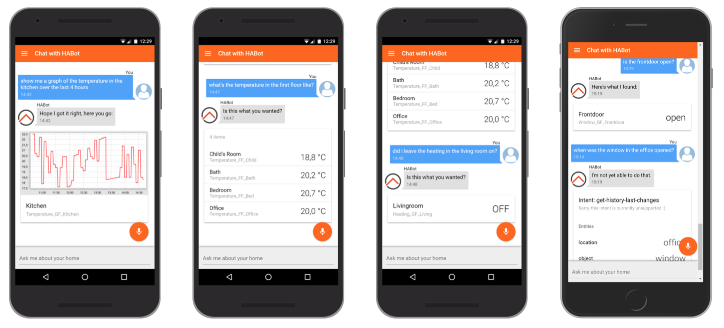 HABot is related to voice, but it actually brings the best of two worlds together: It combines voice interaction with the benefits of graphical user interfaces and thus defines a completely new UI approach for openHAB - a chat bot! You can ask HABot questions about your home and it is able to present the desired information on the screen; this can be suitable widgets to control some devices, it can be a chart with historic values or an image of a webcam - anything you wish. It is furthermore highly customisable, i.e. it is possible to fine-tune its feedback and the next time, the customised screen will be shown right away. It is also context sensitive, so depending on the situation - e.g. whether you are at home or not or whether it is night or day - it can present different responses.